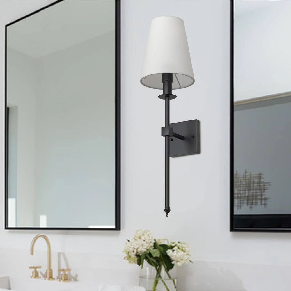 - Fashion style: crafted of metal in a fashionable finish, this fixture features a clean-lined square backplate, a white fabric tapered cone shade ensconces one LED bulb (not included) to diffuse bright light as it’s dispersed throughout your space