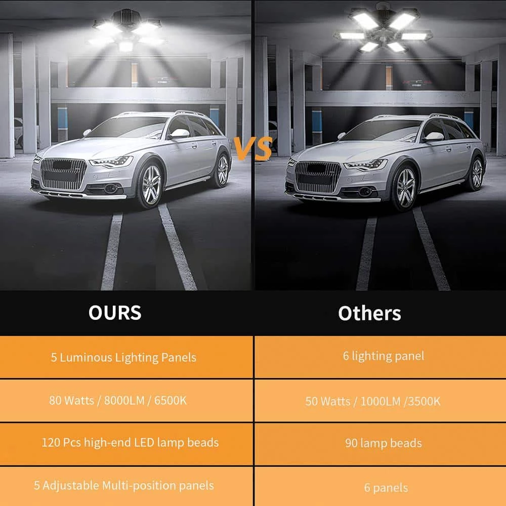 - 2) super bright and energy saving, 5 deformable panels, 120 high-quality LED chips, each garage led light will produce 8000 Lumens of brightness, which is equivalent to 3 fluorescent lamps, but consumes less energy