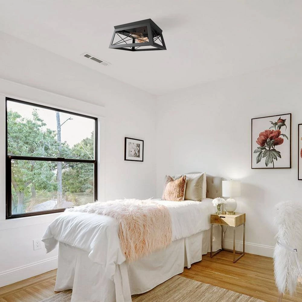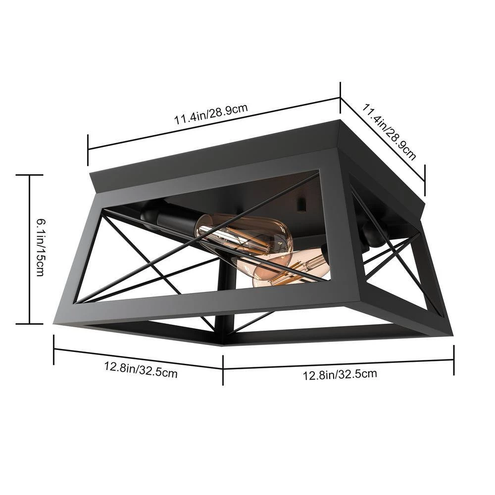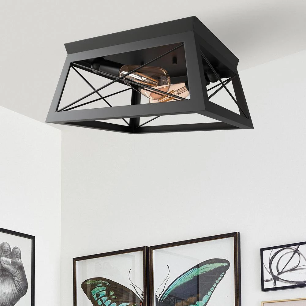 The black coating and geometric rectangle cage design add a vintage farmhouse feel to this flush mount industrial ceiling light. making it a subtle yet striking statement suitable for many spaces, including hallway, bedroom and living room. The bold and rigid lines, sleek flush mount canopy and smooth black finish are signature of elevated craftsmanship.
