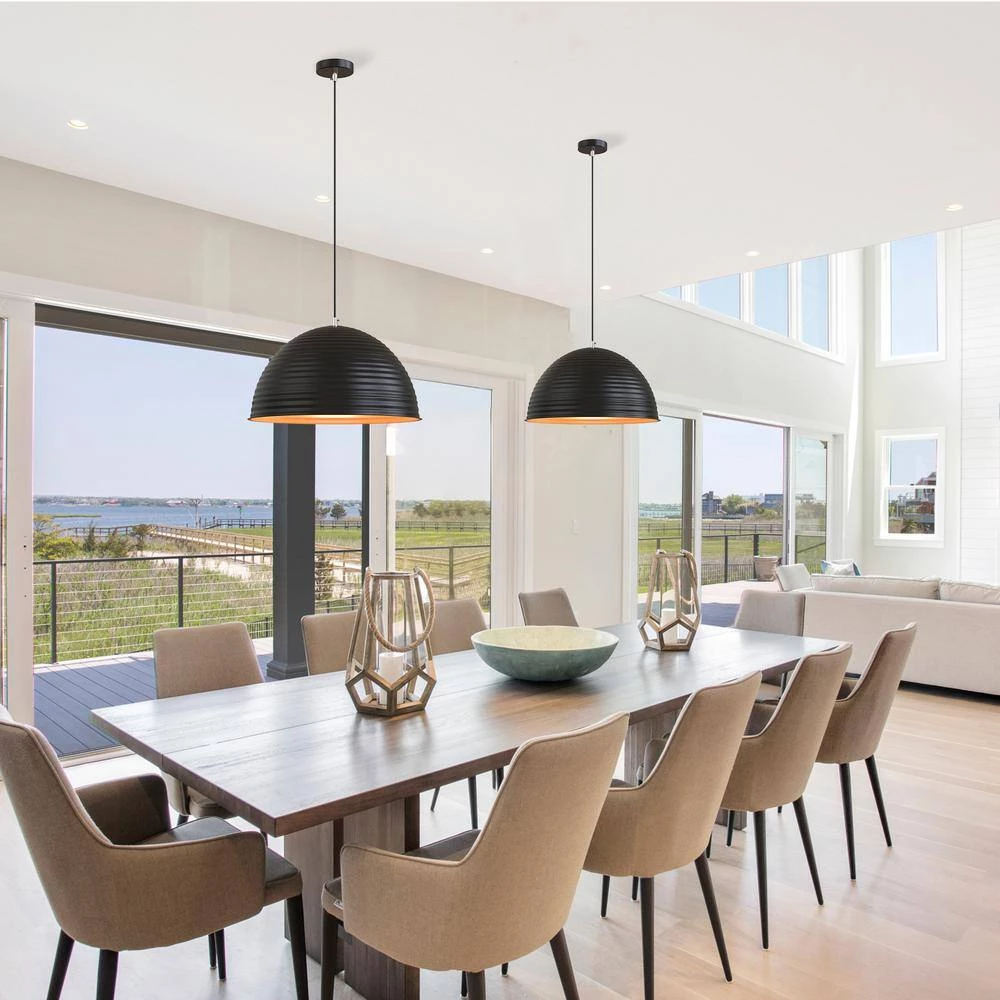 This chandelier is in the shape of a threaded semicircular pot lid with a modern and simple style. The exterior is black, the interior is golden, and the whole is noble and generous. It is suitable for installation anywhere.