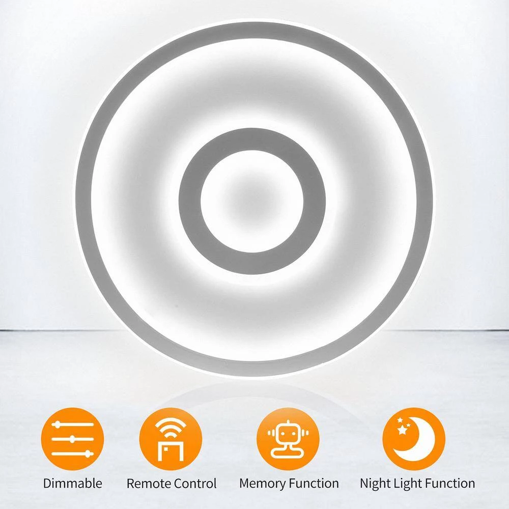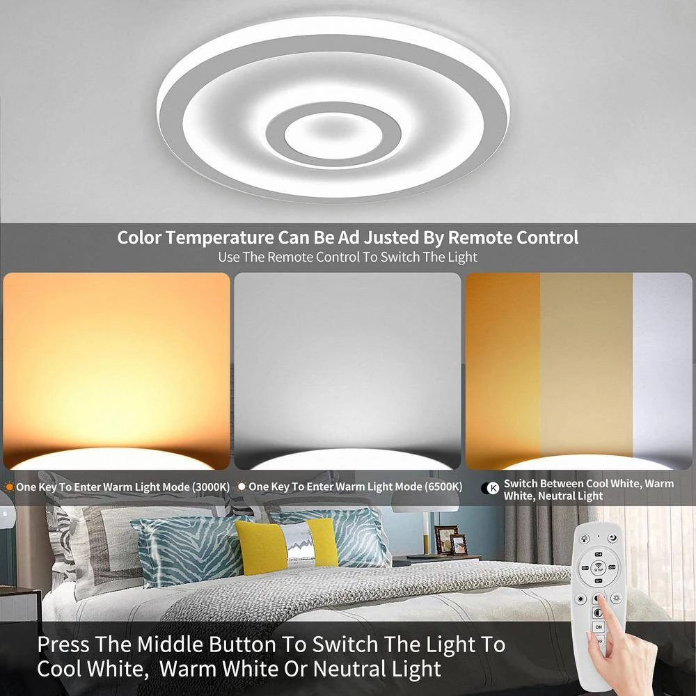 60-Watt LED ceiling lamp, inner and outer ring lighting, no lighting dark area, better lighting effect than ordinary ceiling lamps. with night light function (10% brightness) it can be used as night light in children’s room and bedroom. this lamp can be dimmed from 100% to 10% and has 3 color temperature change options: white, natural light and warm light.