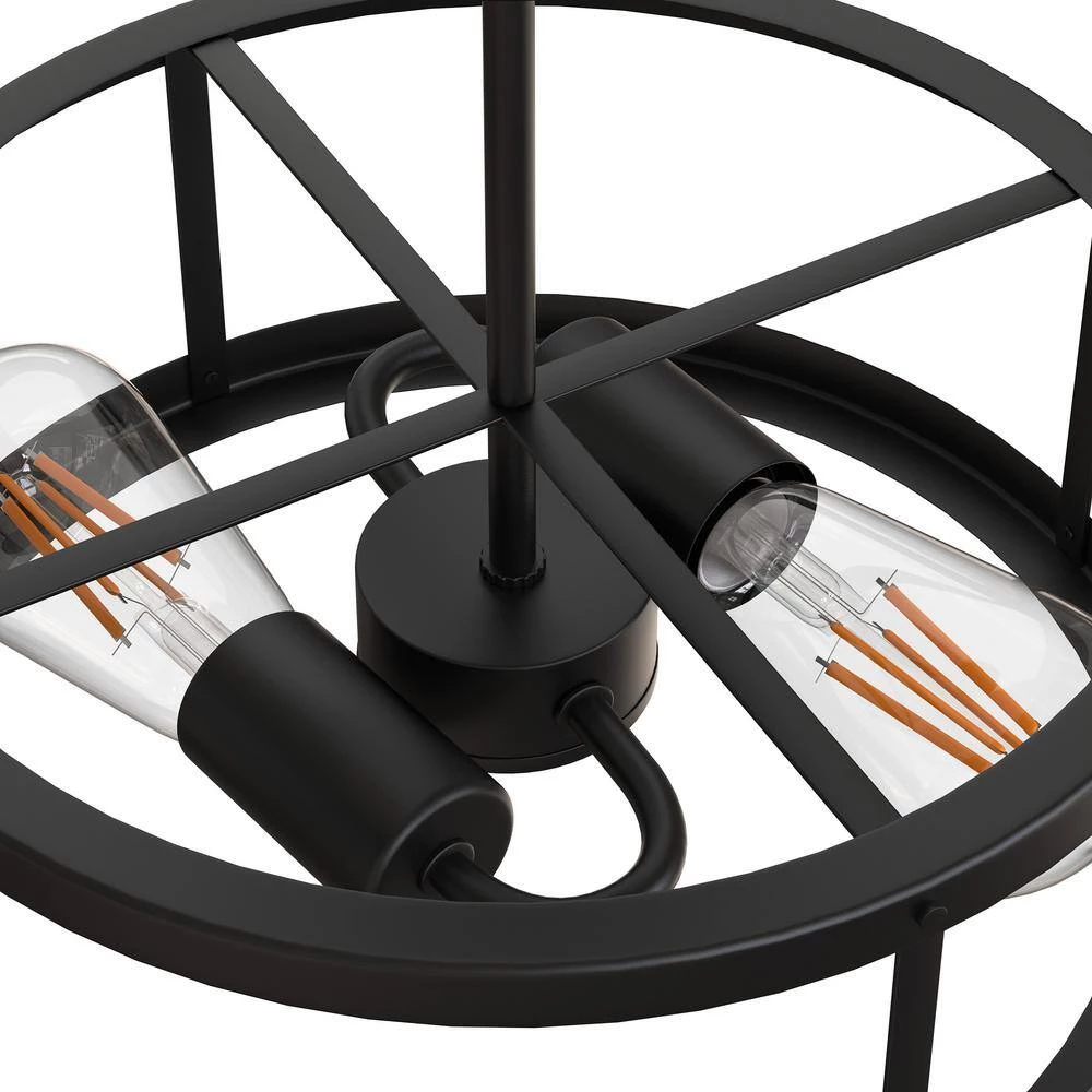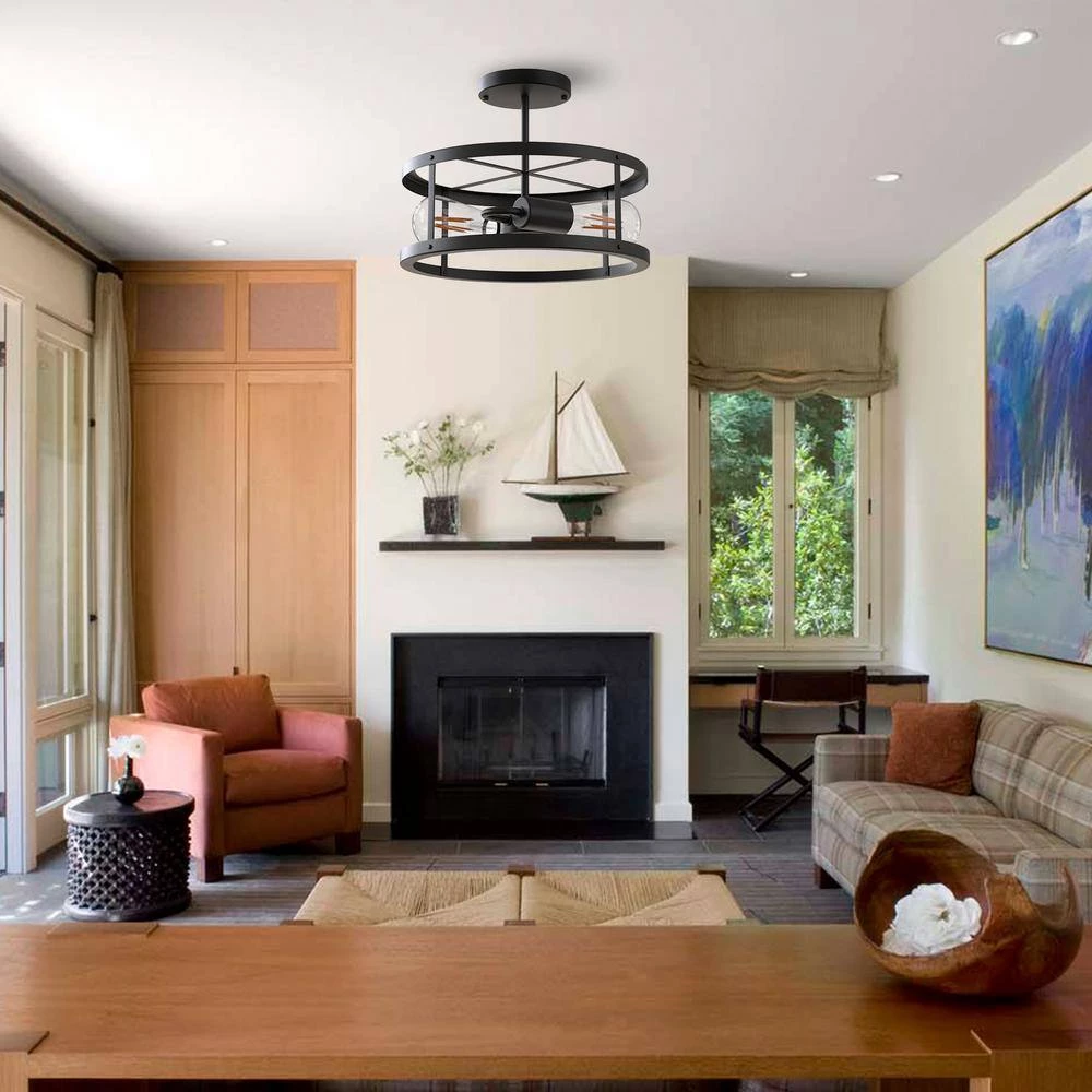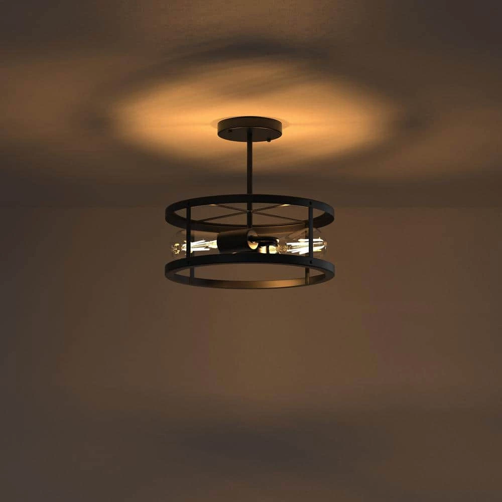 This light is 2-Light Matte Black Drum Semi Flush Ceiling Light. This rustic drum semi flushmount ceiling light fixture features a modern-inspired accent that makes a statement in your room space. This glass ceiling light fixture is perfect for a typical kitchen, dining room, living room, bedroom or foyer.