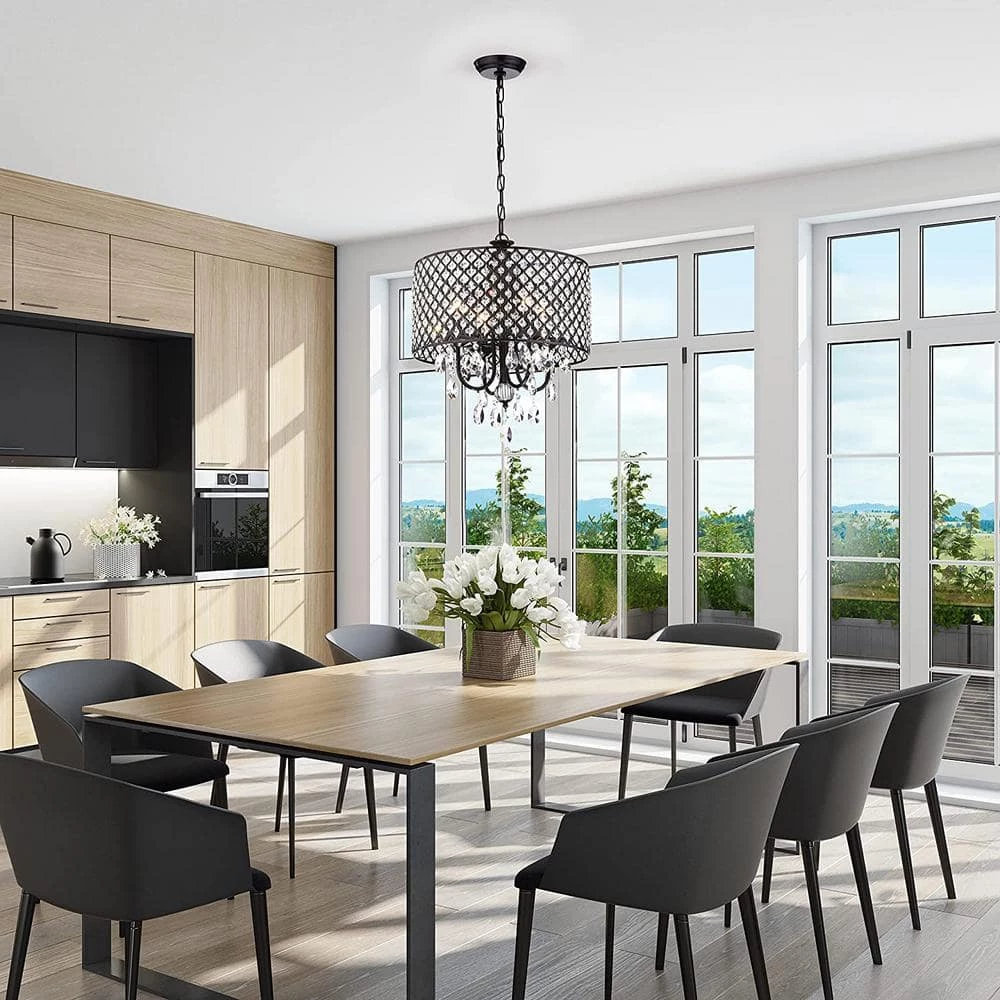 This contemporary chandelier with metal black shades, it is an elegant update for traditional and modern homes alike.It’s the perfect light fixture to install any space you like. The 4 lights chandelier comes pre-assembled, all you need to do is to get it wired.