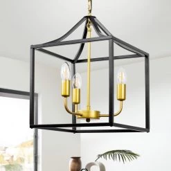 This 3-light chandelier brings architectural interest and clean lines to your entryway or dining table. It’s made from metal in a versatile black finish and has a lantern shape with a gold base for a chic, modern look. A golden candle holder holds 3 candle-style bulbs up to 60-Watt (bulb not included) to light around your space. You will absolutely fall in love with this great lighting and antique look.