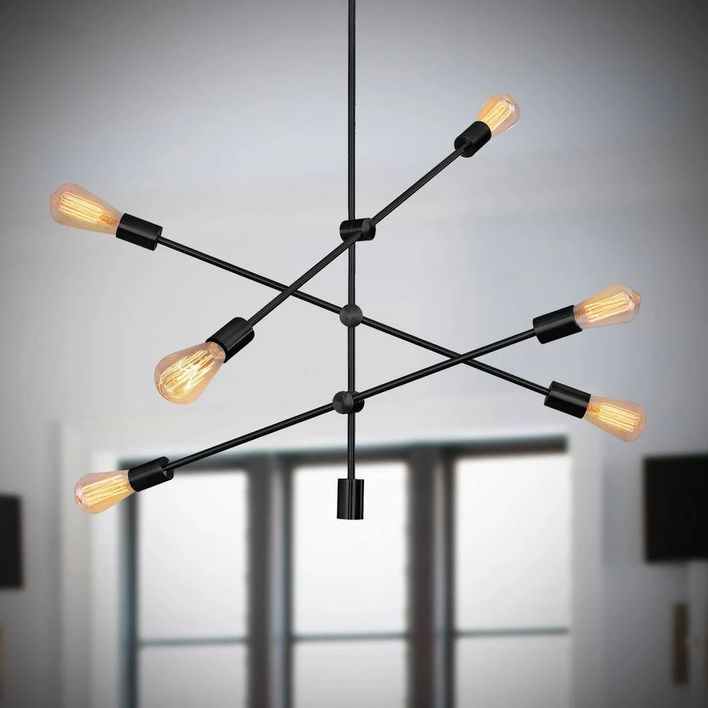 Crafted from metal in a sleek black finish, this quasi-minimalist 6-light chandelier lends a splash of mid-century modern style as it illuminates any room in your home. A practical illuminator and also a charming home decoration whether suspended in the foyer, dangling over your dining room table, bar or cafe shop. 3 arms radiate from the center and each arm is dotted with 2 exposed Edison amber bulbs(not Included) at both ends to cast a warm and relaxing glow throughout your ensemble.