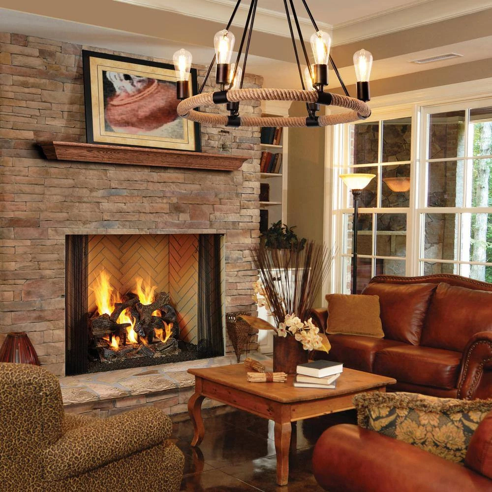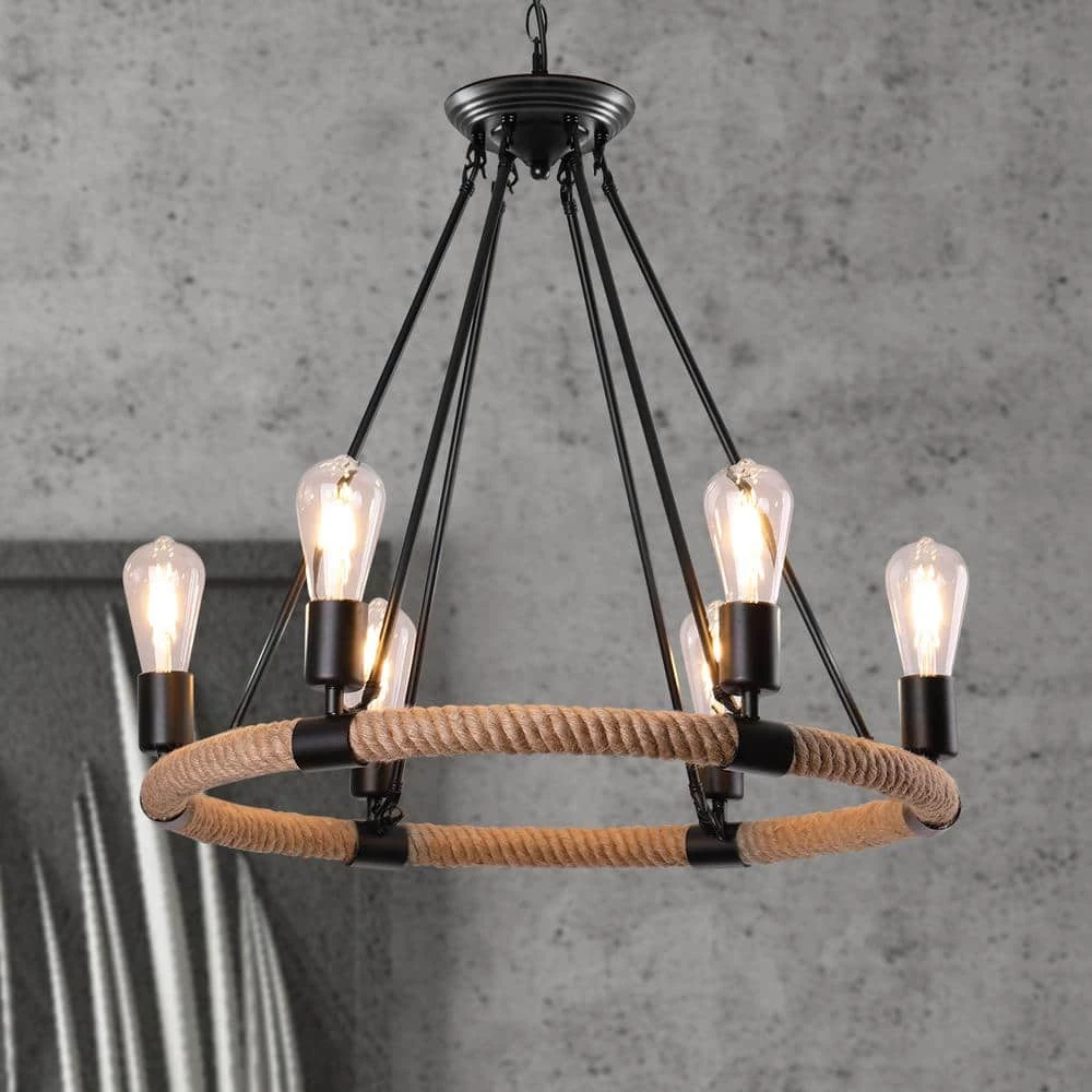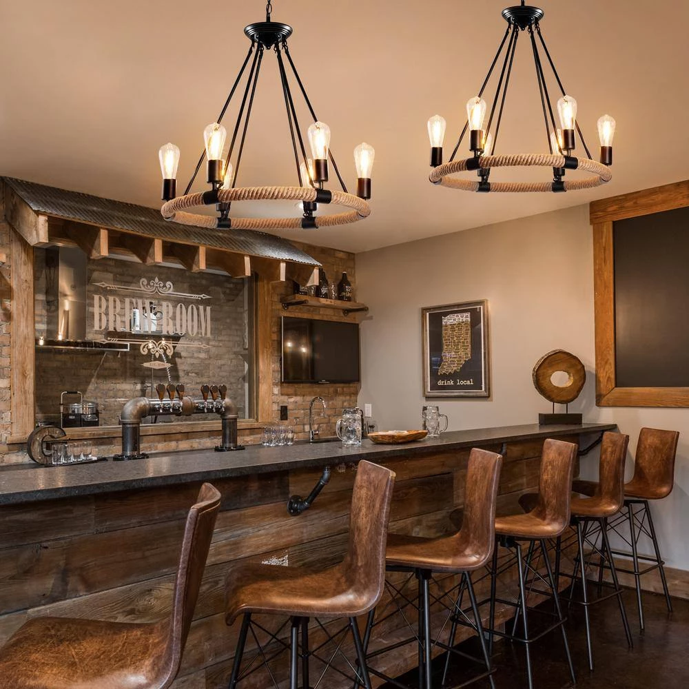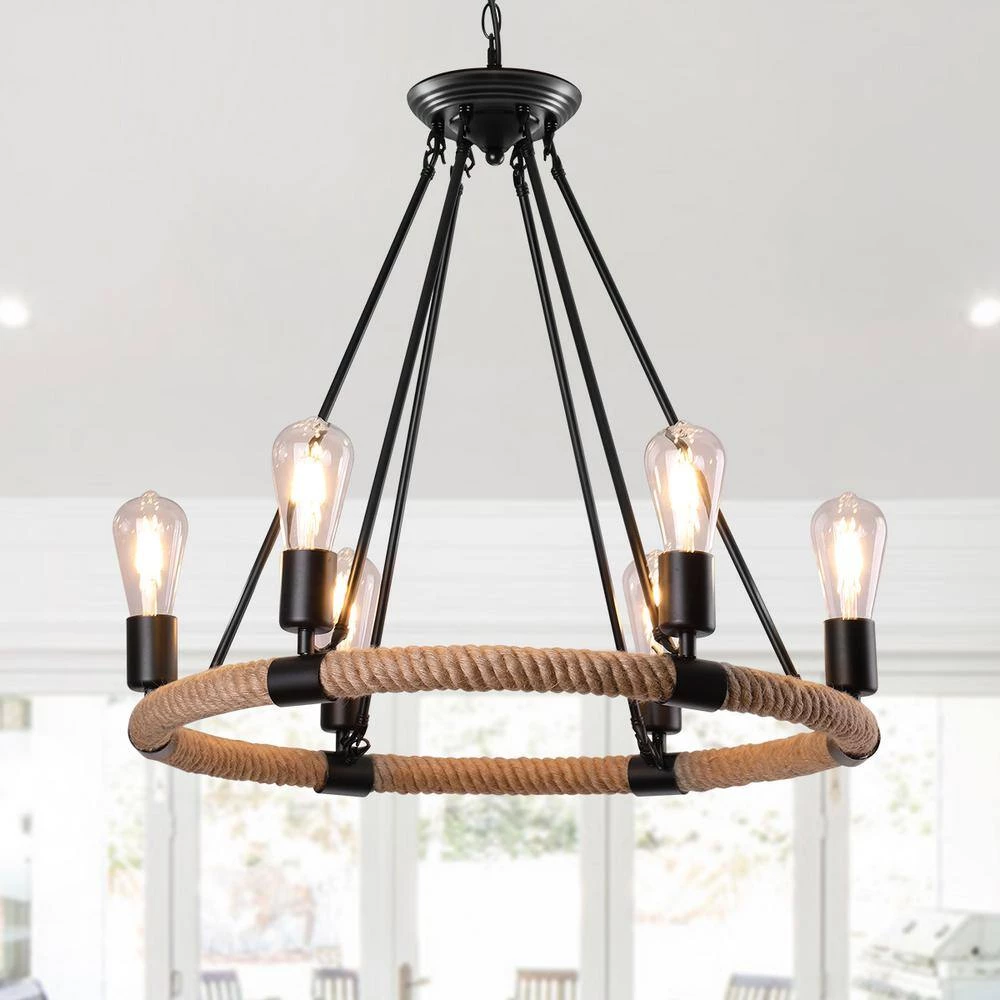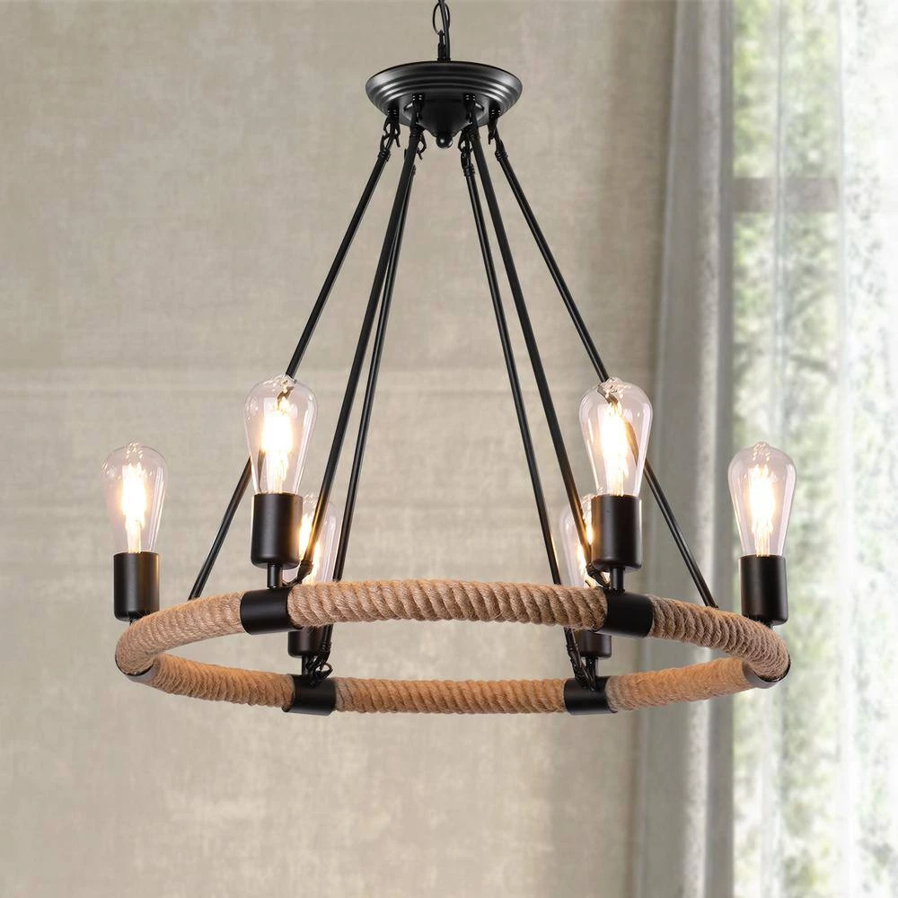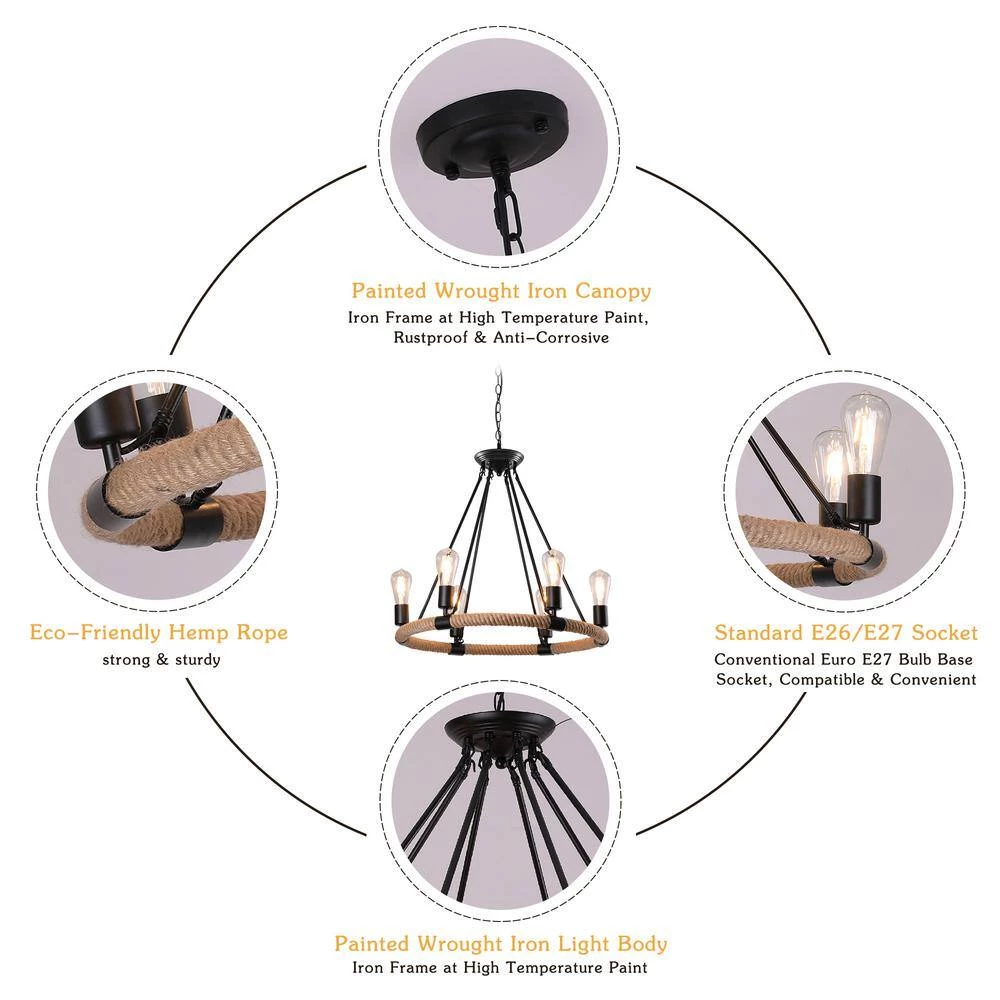 Engineered with minimalist open frame based on industrial-rustic and wagon wheel design, this chandelier creates a vintage industrial look and works well in a rustic and minimalist room. Our single-tier wagon wheel chandelier consists of 6 bulb sockets on a circular blacksmith steel base wrapped in a hemp rope. Any hanging height is available as the hanging chain is adjustable to suit different ceilings. Showcase your hand-on ability and enjoy the fun of DIY assembly with this retro industrial chandelier now.