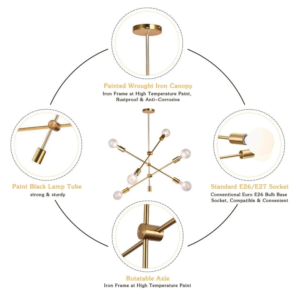 - Light luxury style: forget the past and the present with the hopeful modernism of this gold mid-century sputnik-inspired chandelier, an attractive accent to any home decor from farmhouse to contemporary, suitable for dining room, kitchen, living room, bedroom, bar, coffee shop, restaurant, hallway, rustic entryway, etc.