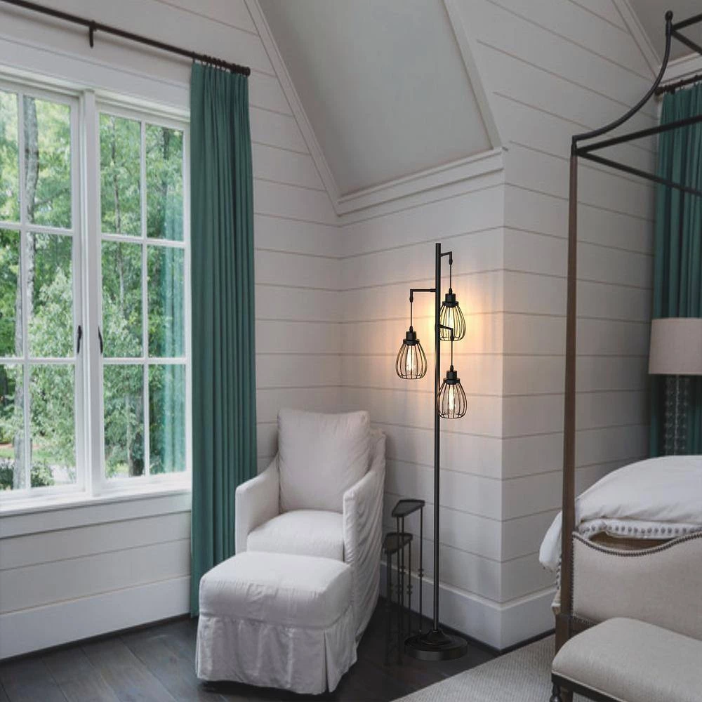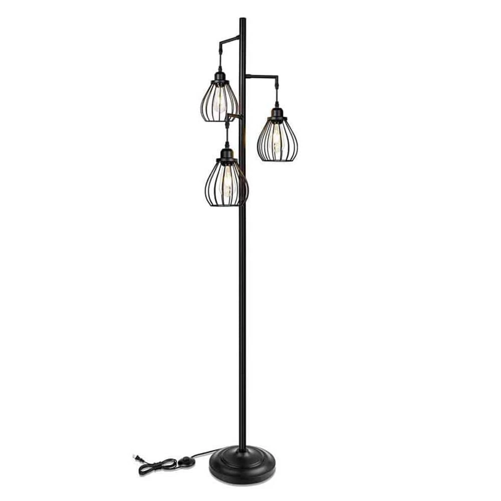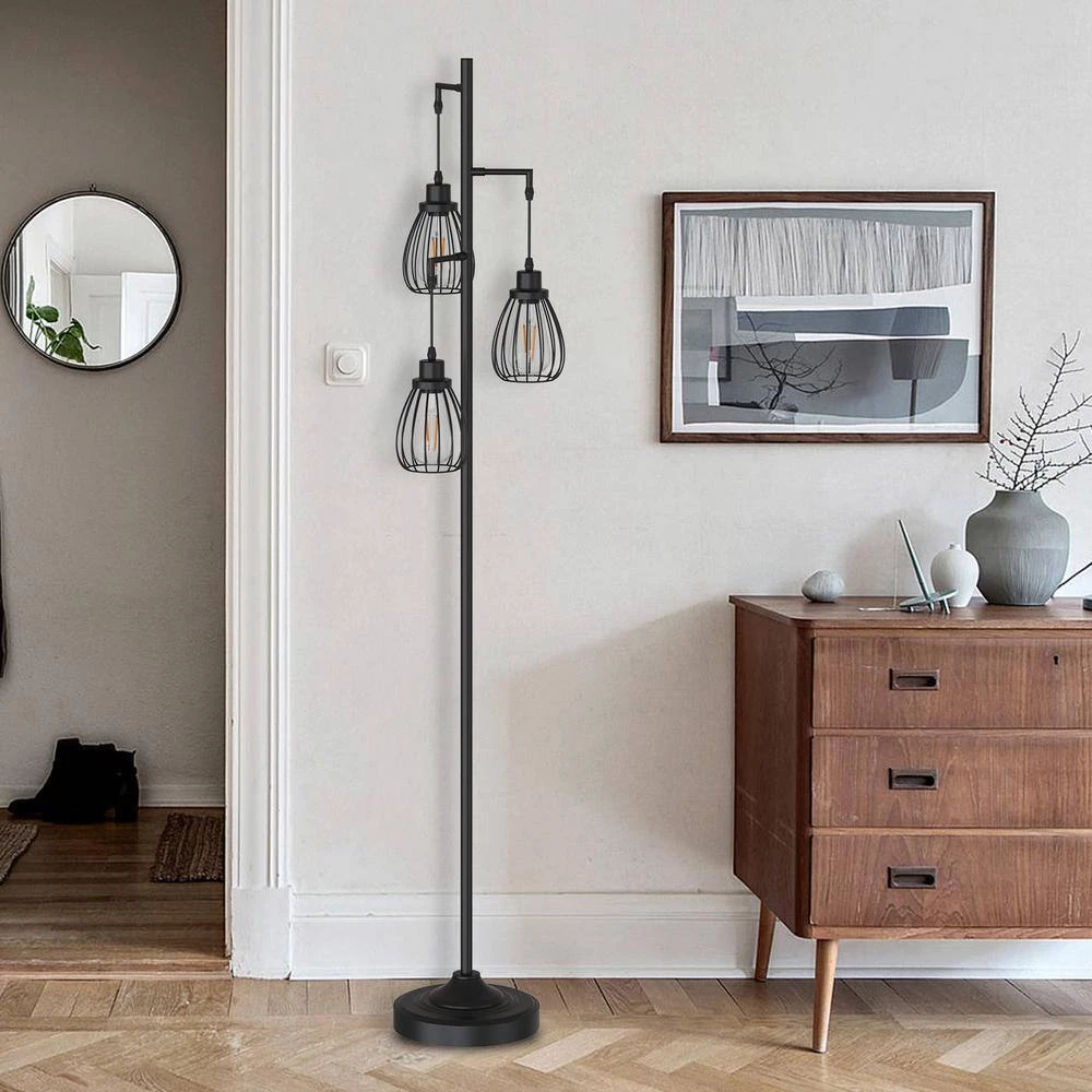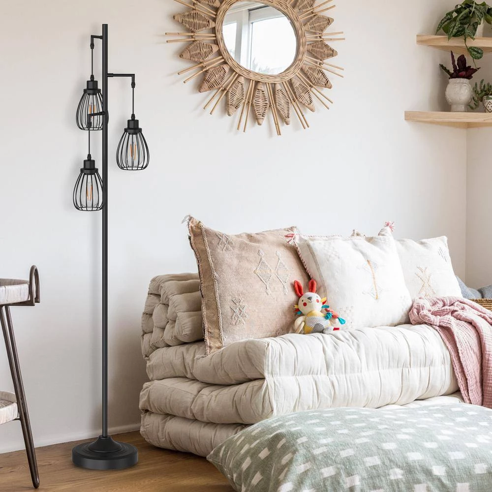 Add modern industrial style and an inviting glow to any space with this 3-light floor lamp.Three adjustable lights extend from the center pole, each topped with an open cage shade. We love how its streamlined design makes this lamp fit with decor styles from contemporary to farmhouse.