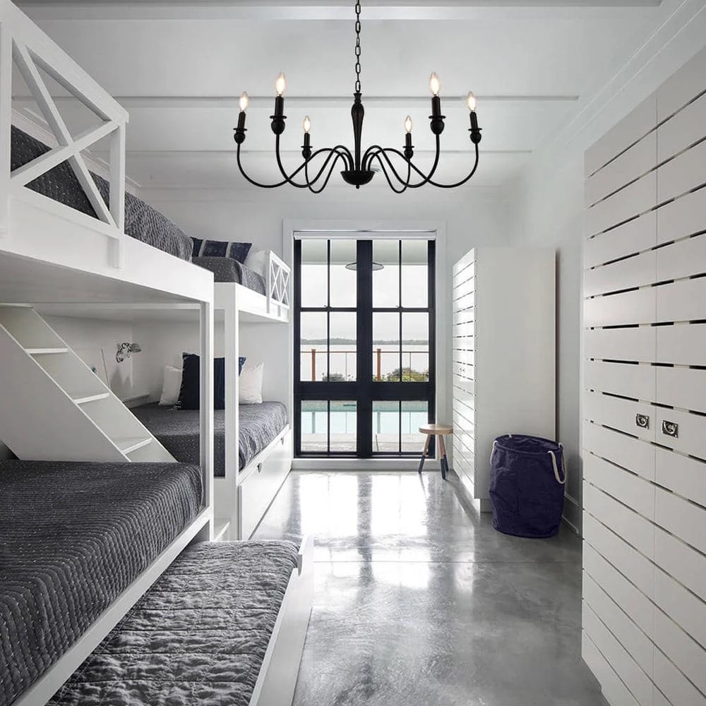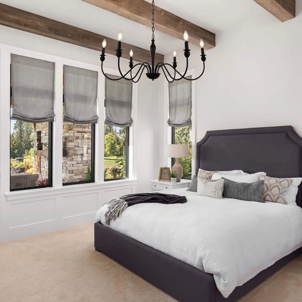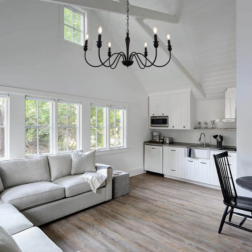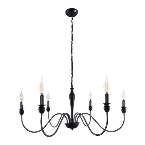 The 6-lights iron chandelier light is designed for country style home decor. Its traditional candlestick silhouette continues the rustic design of farmhouse chandeliers and transitioned to modern contemporary style, providing a more detailed and elegant look for this black pendant light. The whole structure of the light is solid and smooth, ensuring many years of use without damage.