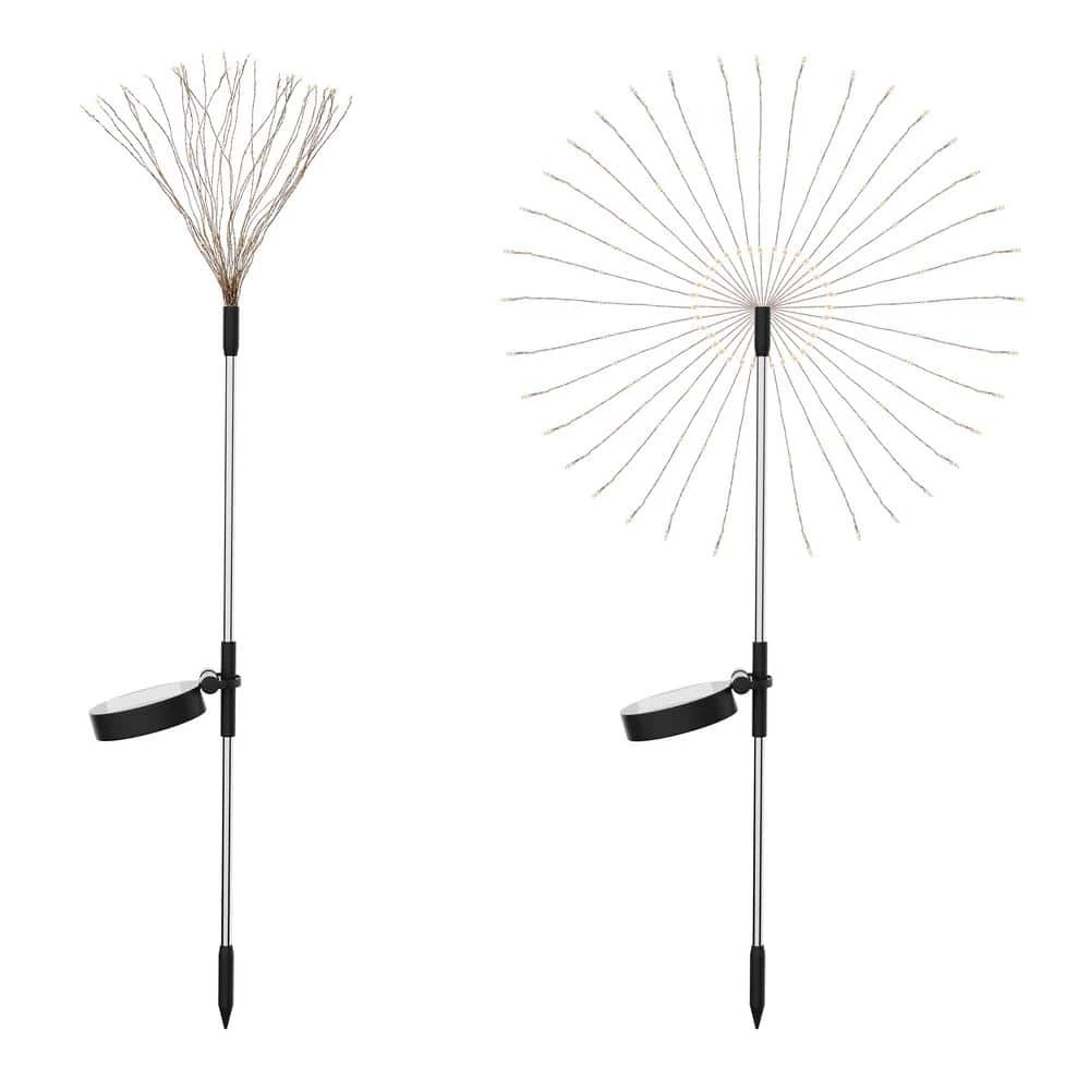 - 2 set 120 LED solar firework lights: Outdoor firework lights with the size of 9.84 x 25.59 in consist of 120 LED breads in copper wires, a solar-powered device, and stainless steel. The lights with 120 LED breads constantly and stably emit the warm-white light in all directions to the surrounding area at 1.2 voltage, shaping your garden with a unique feature.